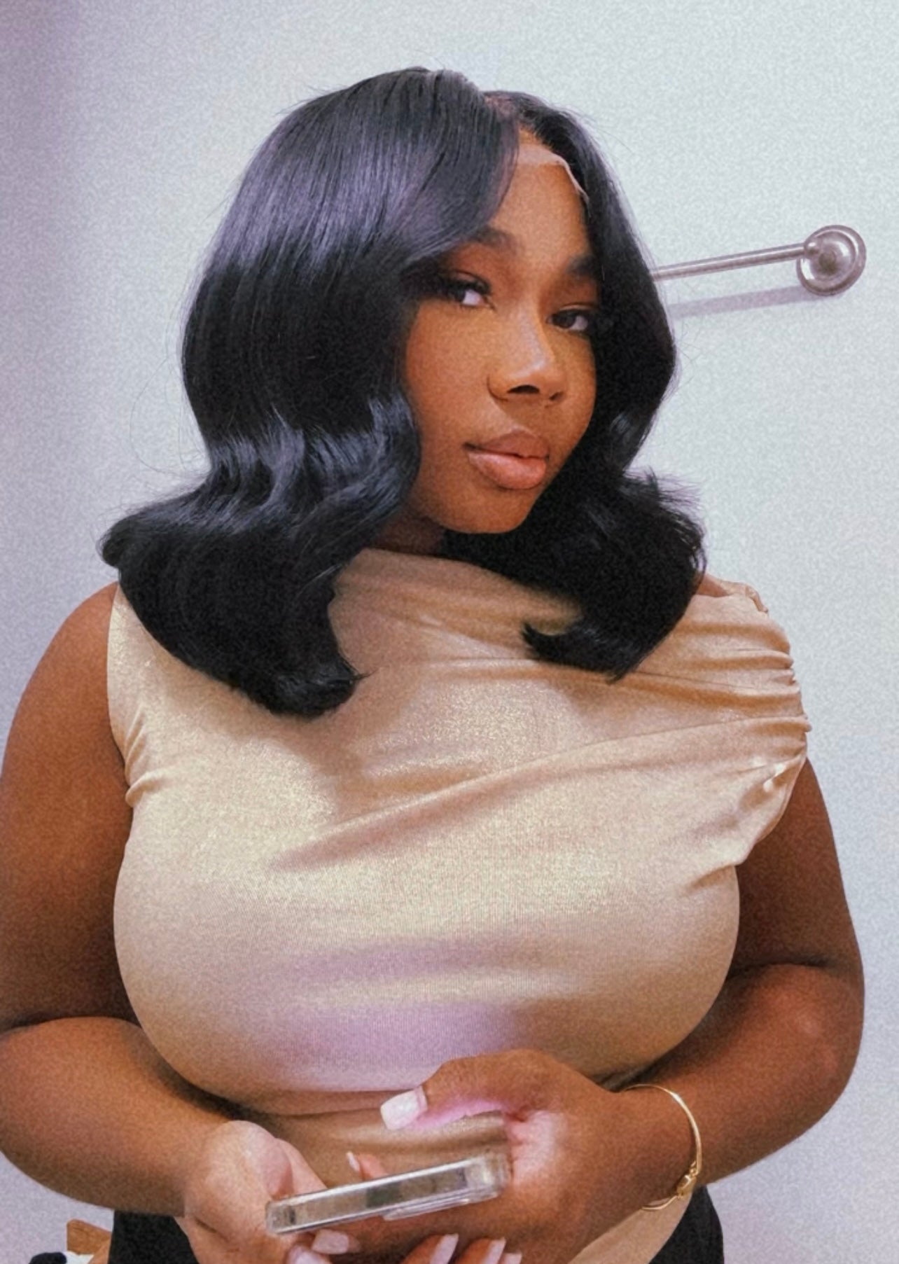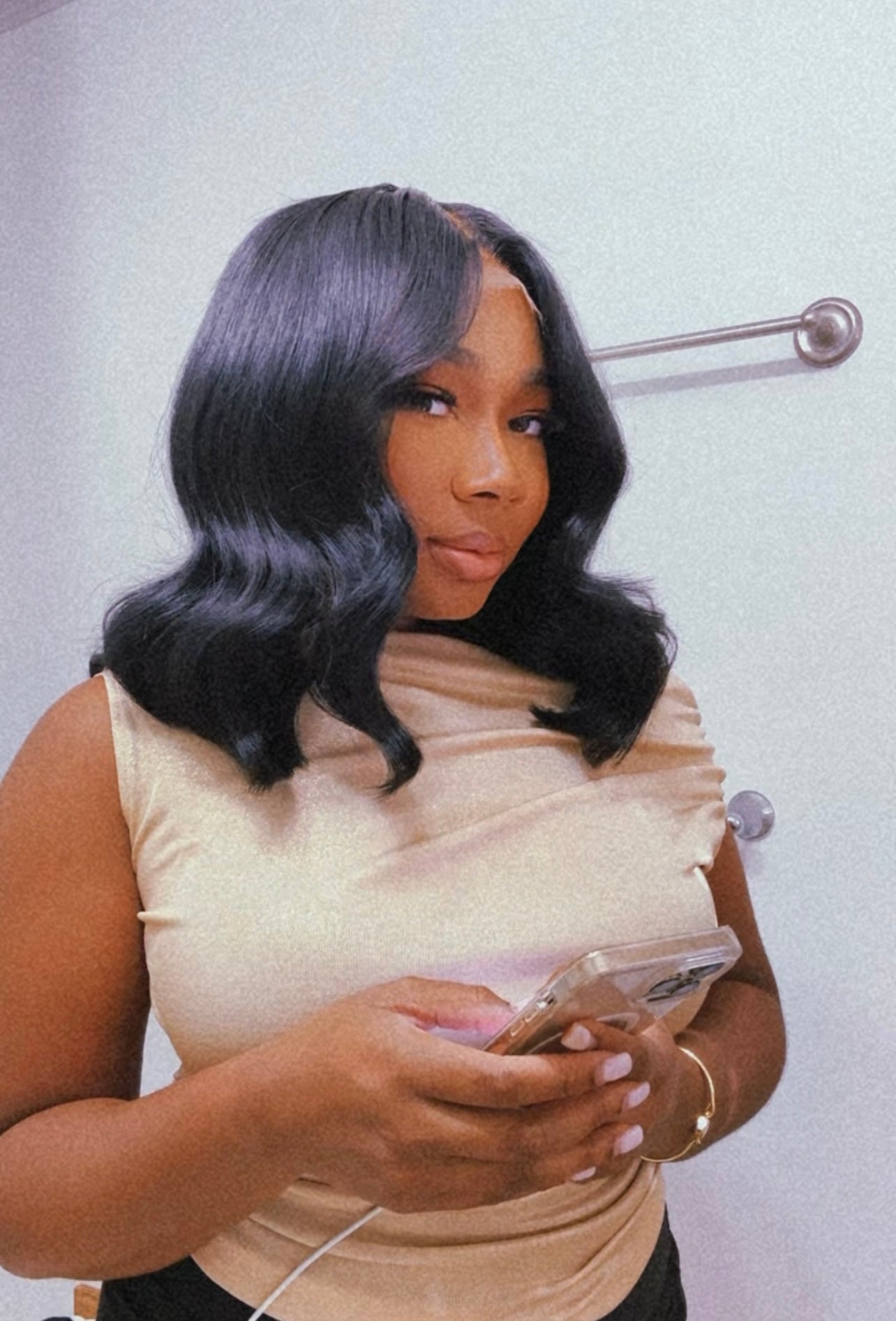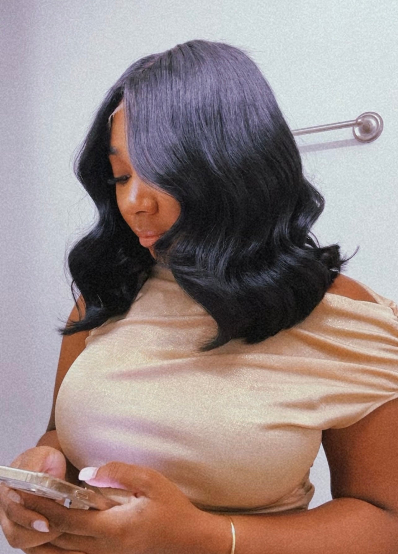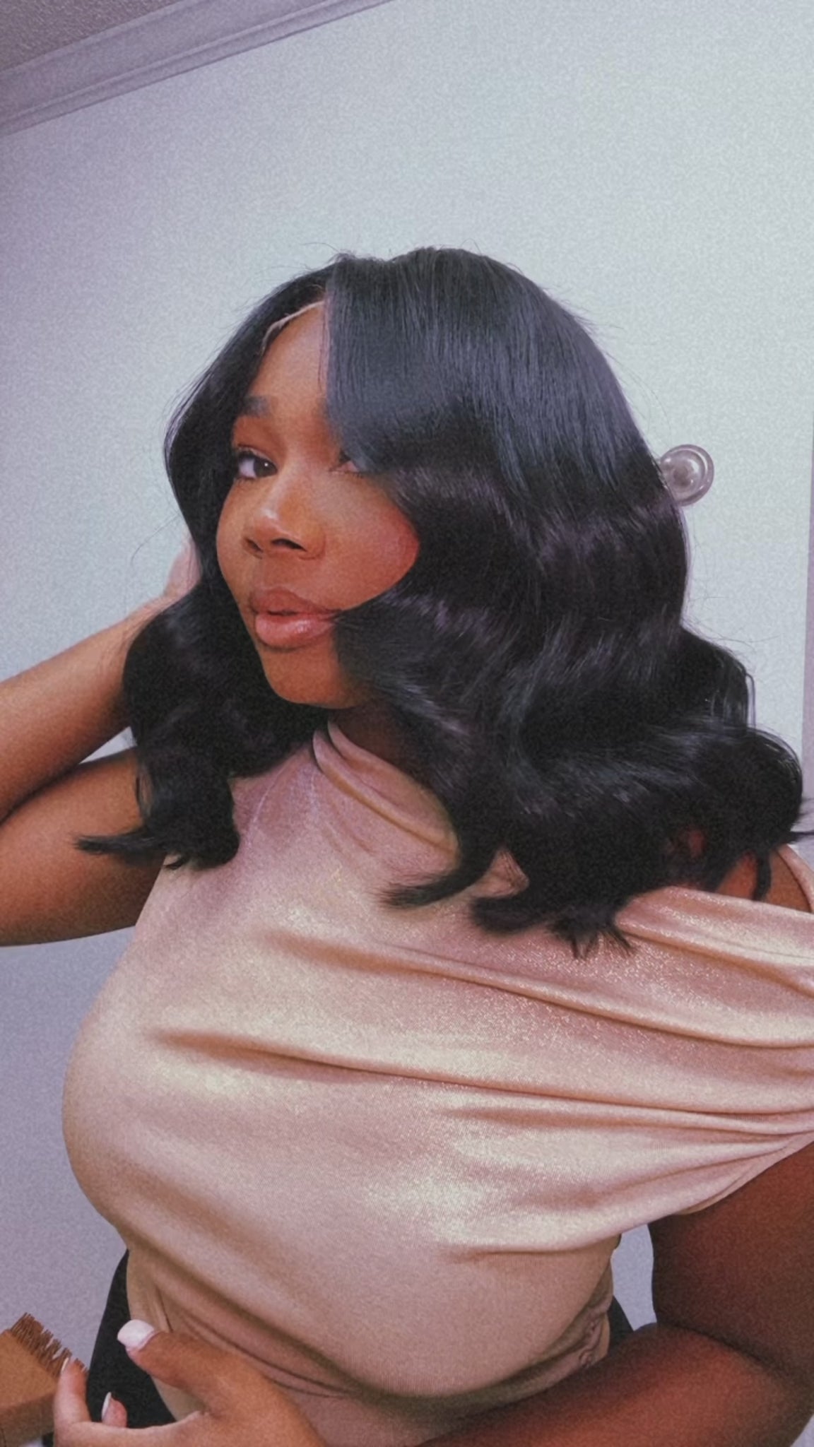 Meet Corporate Kourtney! She’s a mid length bob with the density of 3 1/2 bundles featuring beautiful beach wave curls. This look is perfect for the office/day and can transition into the evening/night effortlessly.