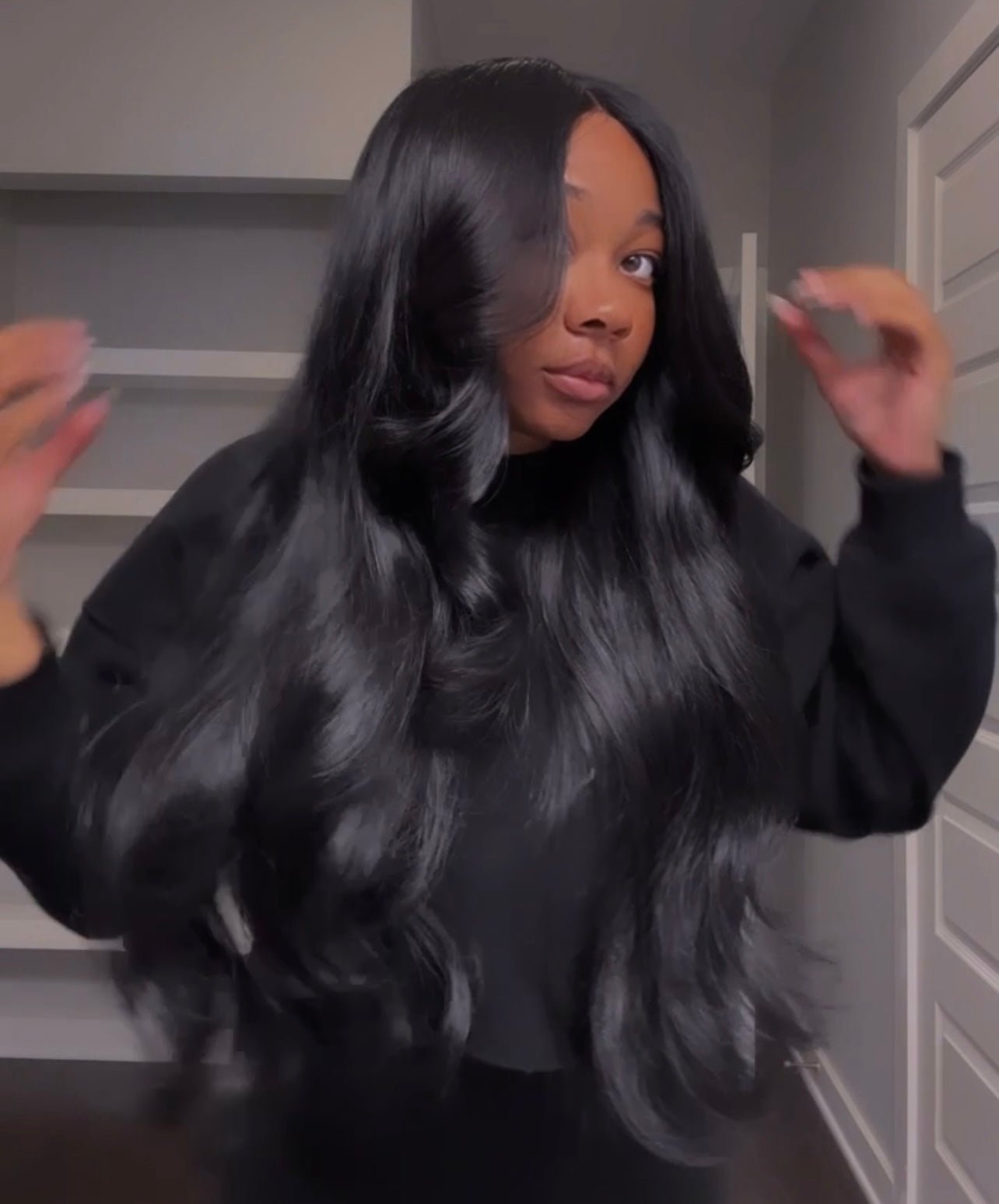 Michelle is constructed using five bundles (24,24,26,26,26”) with a 18” Closure (5x5 HD Lace) colored Jet black! She has long layers featuring these soft loose curls that flow effortlessly.